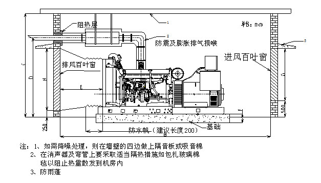 c.為了降低機房溫度,排煙管道應(yīng)用隔熱材料包扎;如果允許的話,盡可能將消聲器及大部分排煙管安排在機房外。